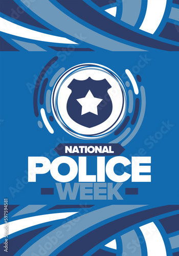 National Police Week. Celebrated annual in May. In honor of the United States police hero. Police badge and star. Officers Memorial Day. American patriotic design. Vector poster, creative illustration