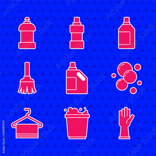 Set line Soap water bubbles, Rubber cleaner for windows, Ironing board, Bucket with foam, Feather broom, Basin shirt, Bottle cleaning agent and Laundry detergent icon. Vector