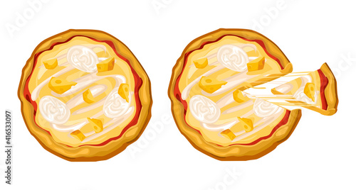 Cheese pizza whole and with a cut piece, cheese stretches appetizingly, with pieces of mozzarella and hard cheese.