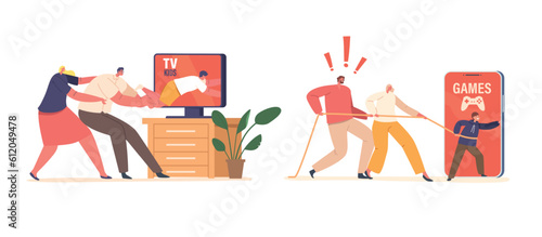 Parents Characters Anxiously Pull Their Child On A Rope, Desperately Shielding Them From The Potential Dangers