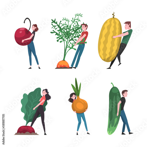 Man and Woman Carrying Huge Fruit and Vegetable Vector Set