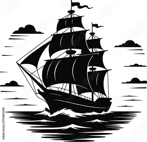Simple silhouette representation of a three masted sailing ship at sea