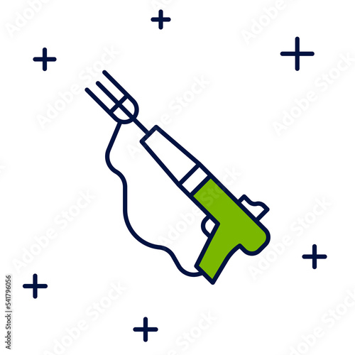 Line Fishing harpoon icon isolated on blue background. Fishery manufacturers for catching fish under water. Diving underwater equipment. Colorful outline concept. Vector.