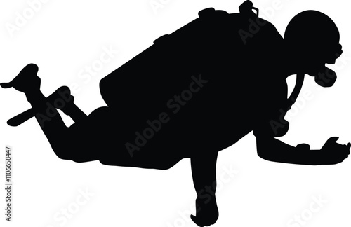 Scuba diving silhouette vector illustration isolated on white background.. Sport underwater, water sea, glove and flashlight, mask and snorkel. Diving school, Scuba school. Beach fun, fishing,swimming