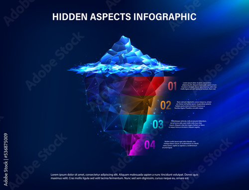 Infographic iceberg, shows hidden aspects and levels for presentation, banner, poster, app. Vector info banner success iceberg. The price of success and hidden nuances. 3D polygonal banner