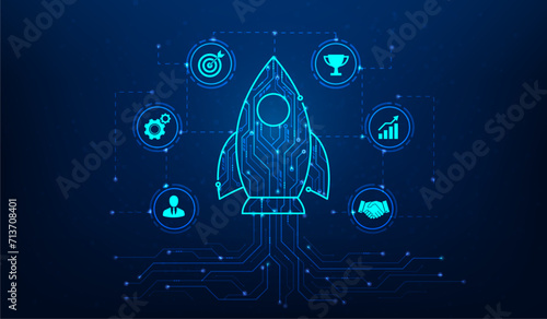 rocket launch business start up digital technology on blue background. new business growth success. leadership strategy achievement. vector illustration hi-tech line circuit design.