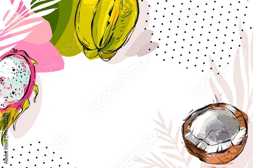 Vibrant flat design illustrations of tropical fruits and leaves orange dragon fruit