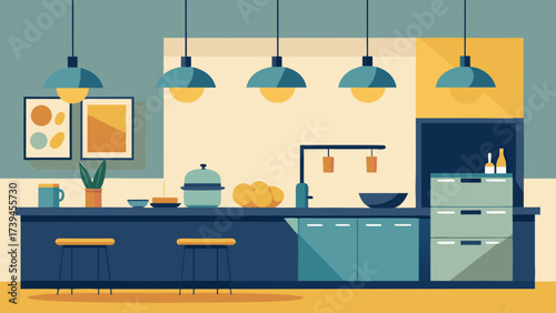 Isometric illustration of two people working in a coworking space with laptops and bar stools under stylish hanging lights. Business planning, work strategy, coworking space
