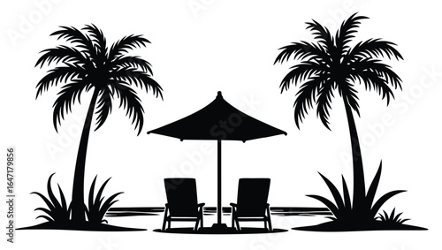 Tropical Retreat: Silhouette of a shaded gazebo on a tropical beach. Two lounge chairs invite relaxation amidst towering palm trees. Embrace the sun and serenity.