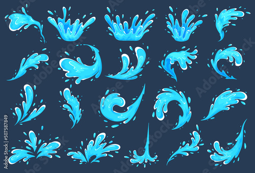 Cartoon rain water puddles. Blue liquid water splash, drop, spill and leakage top view. Isolated vector puddles, pools and wet stains with bubbles and droplets on surface, environment or nature themes