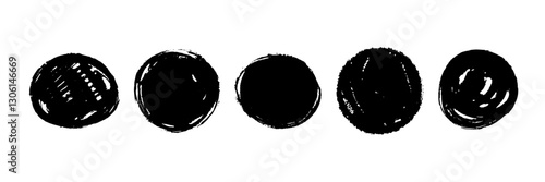 Round dry paint stains set. Black grunge ink circle collection. Textured brush stroke radial element pack. Hand drawn charcoal blobs for frame design, template, poster, banner. Vector circular spots