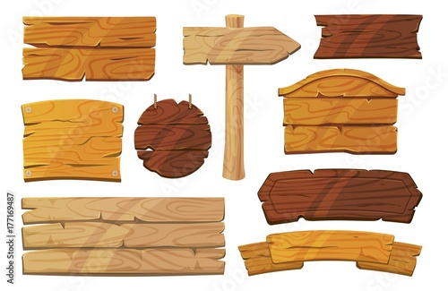 Wooden signboards, vector wood arrow sign billboard set.