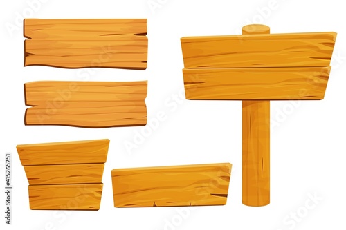 Cartoon wood signboard. Wooden plank frame vector. Game sign board with arrow or rope isolated element. Blank pointer and billboard label set. Direction plaque piece icon for desert road ui graphic