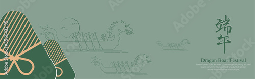 Dragon Boat Festival template design in line minimal style. Dragon boat and zongzi dumplings. Chinese text Dragon Boat Festival. Holiday banner, card, poster, banner concept.