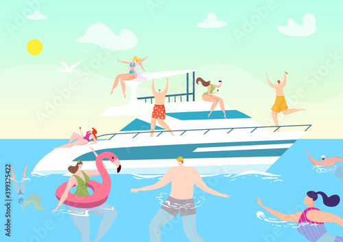 People sailing on luxury pleasure boat flat cartoon vector illustrations.