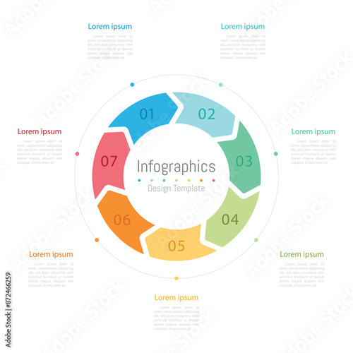 7 steps business process infographic, business infographic, timeline infographic template, strategy infographic, circle infographic, whit 7 steps or option.