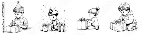 Excited young children silhouettes eagerly interacting with various wrapped gift boxes symbolizing joy surprise celebration and anticipation of unwrapping presents perfect for holiday birthday.......