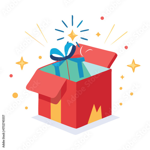 An opened gift box with a radiant glow and golden confetti spilling forth, symbolizing the excitement and anticipation of surprises and special moments.  vector illustration