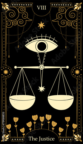 Justice. The 11th card of Major arcana black and gold tarot cards. Vector hand drawn illustration with skulls, occult, mystical and esoteric symbols.