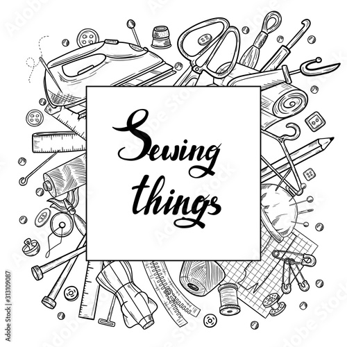 Black and white sketch illustration featuring various sewing tools like sewing machine, iron, scissors, mannequin, thread, and pincushion. Ideal for blog posts, articles, or designs.