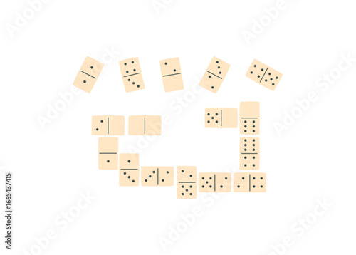 Flat cartoon domino game sticker. Playful boardgame tiles and domino hobby for entertainment, table activity, or childhood recreation. Fun design with tile pieces in flat style.
