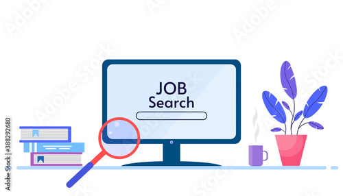 Job Searching concept. Search for jobs online using a computer application. Computer and magnifying glass on a white background. Vector illustration in a flat style.