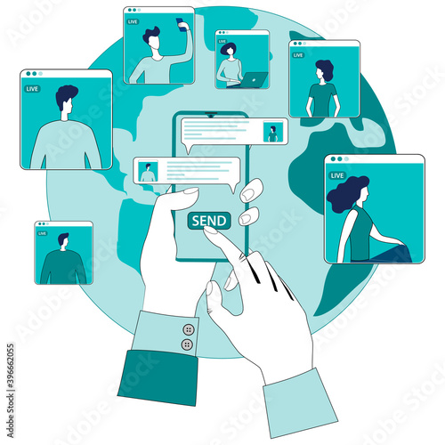 Online communication of people using a smartphone.Teleconferencing, remote work, freelancing, and online education.People on the background of the globe.Flat vector illustration.