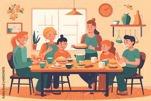 Happy family with children and parents eating in a kitchen. Vector graphic