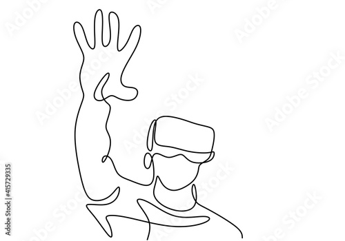 Continuous one line drawing of man reaching something while playing simulation game. Young male wearing a helmet virtual reality glasses isolated on white background. Vector illustration