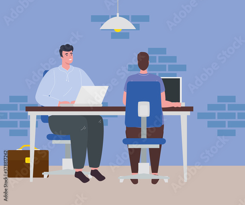Coworking. Cartoon men and women working together with laptop. Freelance and teamwork in modern open space office in city, people communication and business process. Vector workplace flat illustration