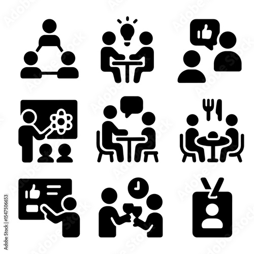 Coworking Space Icons. Solid, filled icons set of coworking community features: networking icon, lounge area,