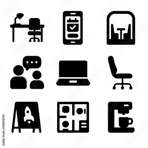 Solid style icons of coworking incubation space: shared desk, hot seat icon, common room, startup cluster, coffee station, pitch wall, smart printer, incubator ID.