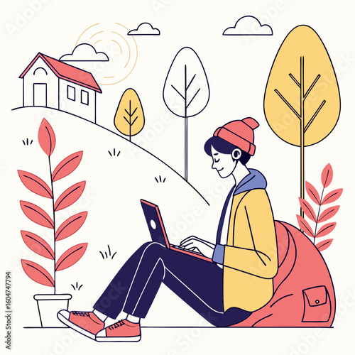 Working at home, coworking space. Online study, education. Coworking center concept. Work at home concept design. Freelancers working on laptops and computers. Vector illustration