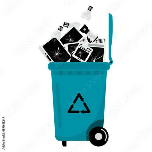 Electronic Waste Recycling Bin. Green recycling container filled with electronic waste including computers, phones, and devices. E-waste concept. Waste management. Flat style. Vector illustration