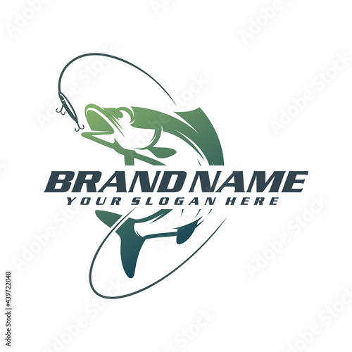Fishing bass logo. Bass fish with rod club emblem. Fishing theme illustration. Fish Isolated on white.