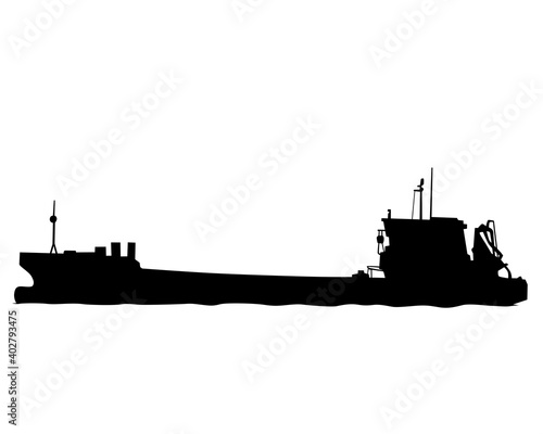 Cartoon illustration of a fishing boat in the sea, in black, isolated