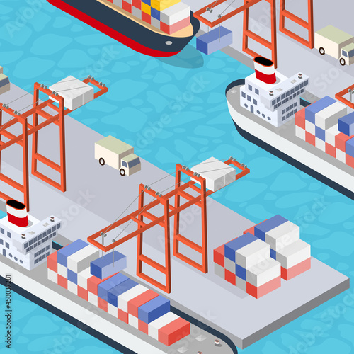 A stylized vector silhouette of a busy seaport shows two large container ships docked under giant cranes.