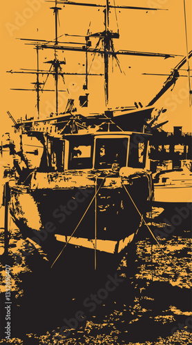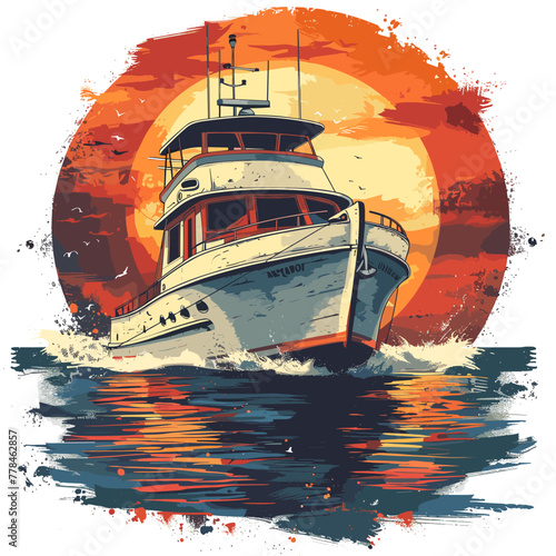Stylized Fishing Boat Illustration with Net on Gentle Waves Ocean Nautical Theme Commercial Fishing Transport Watercraft Vessel