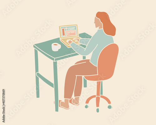 リモートワーク中の女性のイラスト 在宅ワーク テレワーク おしゃれ シンプル 仕事 自宅 パソコン
