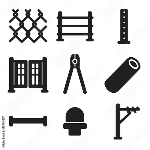 Metal Fences Icons. Solid, filled icons set of metal and chain-link fences: chain mesh, tension wire, steel