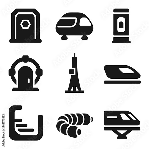 Futuristic Transport Icons. Solid, filled icons set of futuristic transportation hubs: airlock door, shuttle