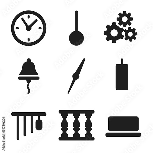 Clock Tower Icon Set. Solid, filled icons set of clock tower parts and features: clock dial, pendulum, gear
