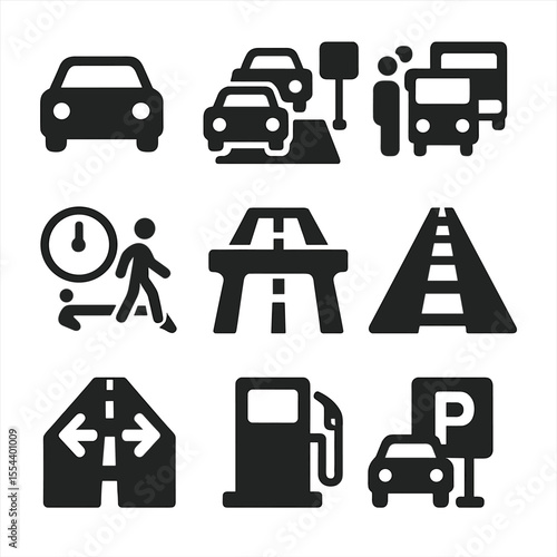 Transportation Icon Set. Solid, filled icons set of transportation and commuting impacts: car icon, traffic