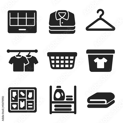 Organize Clean Clothes Icons. Solid, filled icons set of organizing clean clothes: drawer divider, shirt stack