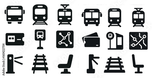 Public Transportation Icons. Solid, filled icons set of public transportation options: city bus, metro train,
