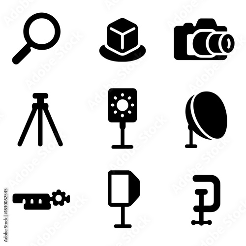 Macro Photography Icons. Solid, filled icons set of macro product photography: magnifying glass, small product