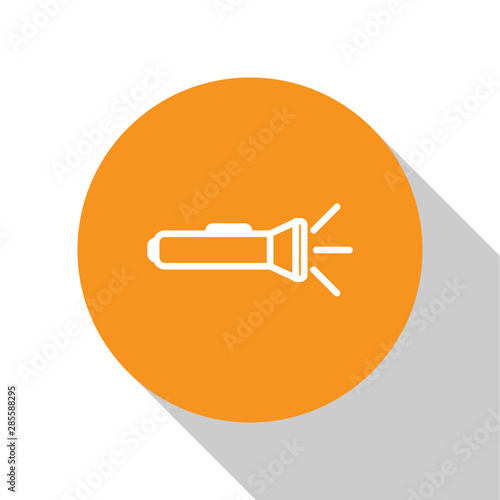 White Flashlight icon isolated on white background. Orange circle button. Vector Illustration