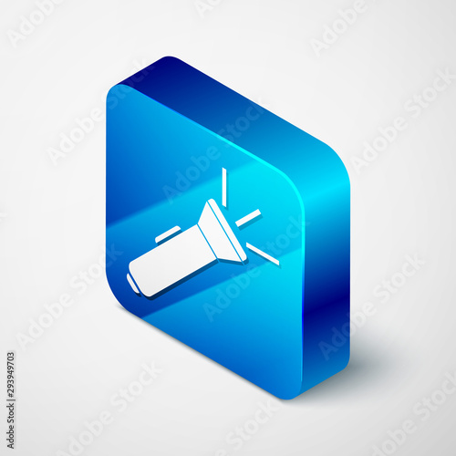 Isometric Flashlight icon isolated on white background. Blue square button. Vector Illustration