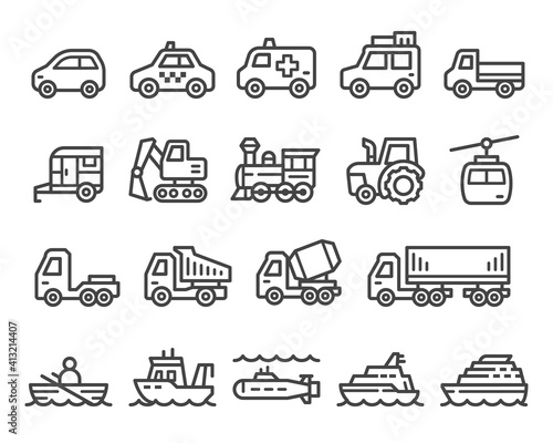 Front view of ground, air, and water transportation vehicles icons set. Vector of bicycle, motorcycle, car, SUV, van, bus, lorry, truck, double decker bus, train, boat, ship, helicopter, and airplane.
