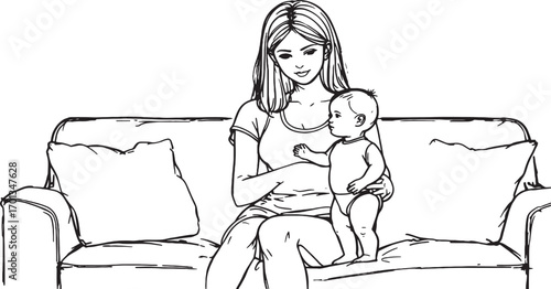 A delicate line drawing captures the tender embrace between a mother and her baby, symbolizing love and new life with a floral accent.
